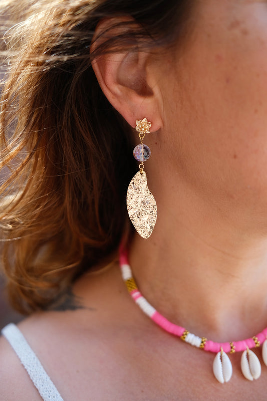 Boucle d'oreille longue en cristal et sequin martelé allongé