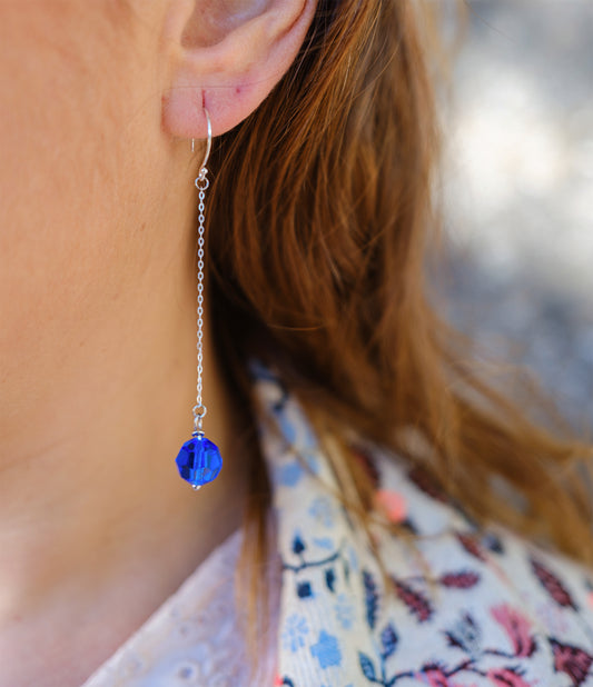 Boucle d'oreille pendante (4cm) en argent 925 et perle en cristal bleu(10mm)