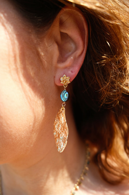 boucle d'oreille longue en abalone et sequin martelé allongé