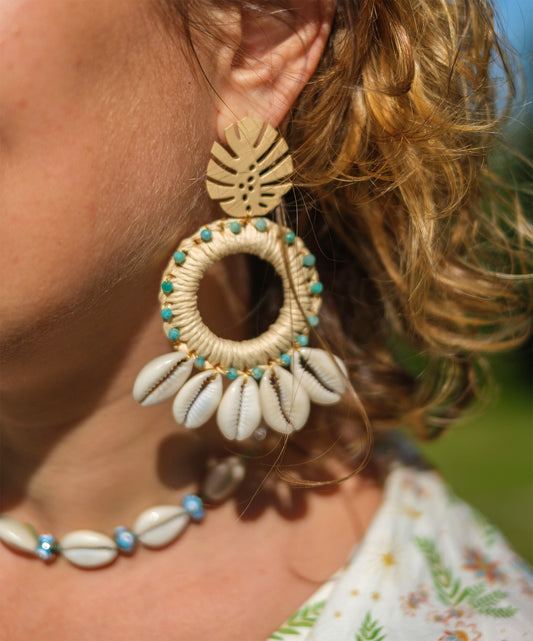 Boucle d'oreille XXL raphia et coquillage cauris