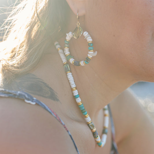 Boucle d'oreille heishi coquillage et abalone pendante cauris and co