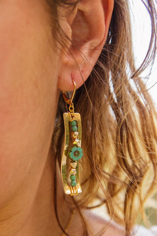 Boucle d'oreille rectangulaire tissé fleur tons vert d"eau