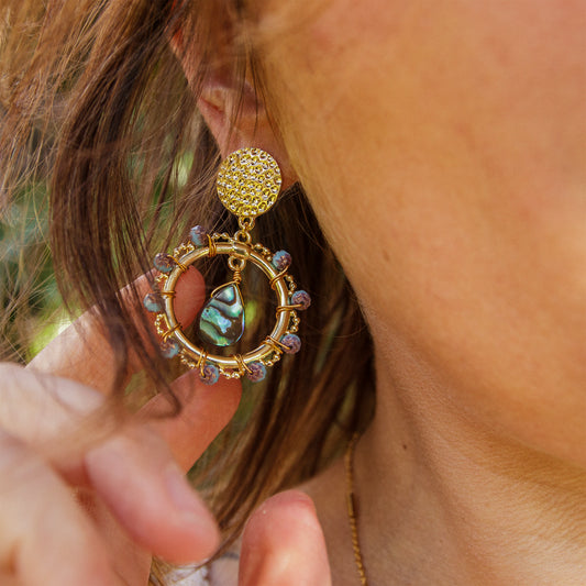 Boucle d'oreille ronde goutte abalone et perle en verre