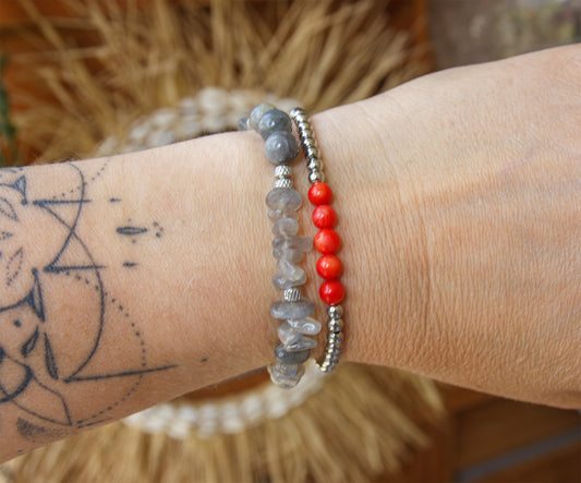 bracelet en corail teinté perle tibétaine et acier inoxydable