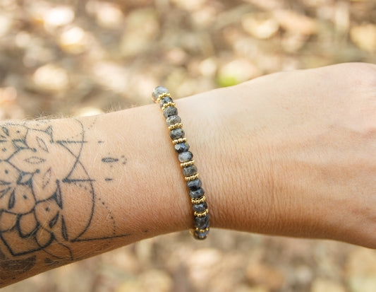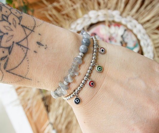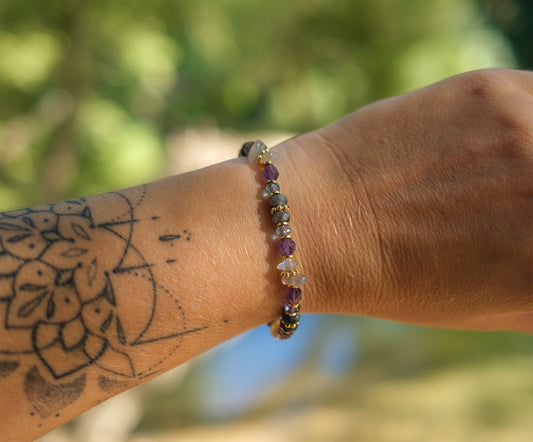 bracelet femme perles d'améthyste, labradorite , perle en verre et chips de labradorite