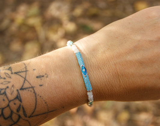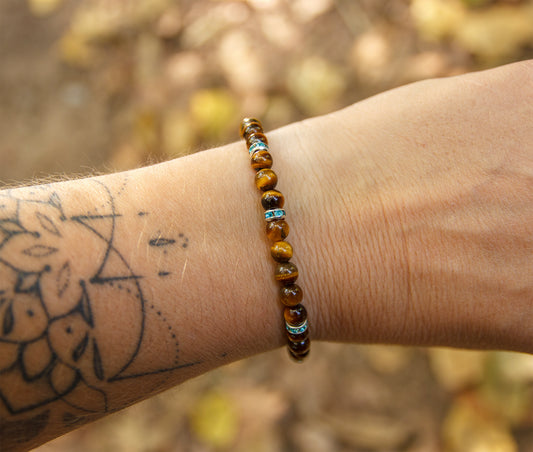 bracelet femme perles oeil de tigre 6mm et intercalaire zirconium turquoise