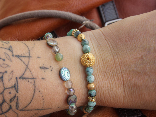 bracelet oursin doré et perle en verre imitation turquoise d'Afrique