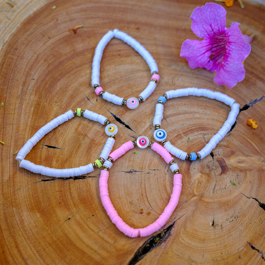 Bracelet perles heishi blanche 6 mm et oeil en nacre rond assorti