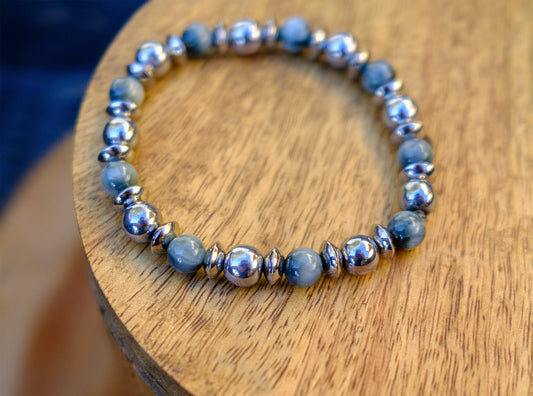 Bracelet homme 8mm oeil de faucon (oeil de tigre teintée grise) et hematite argenté