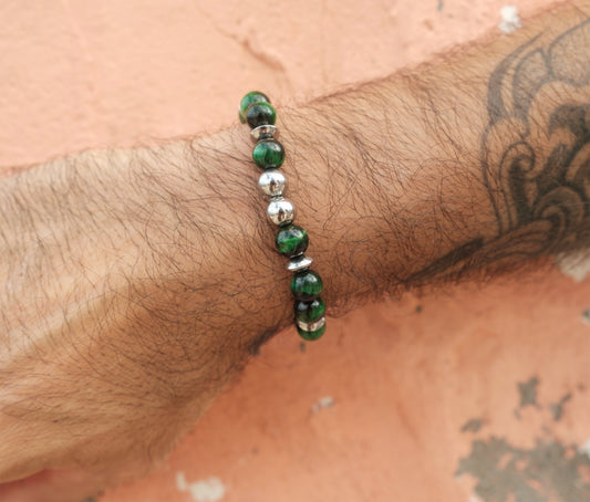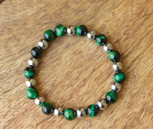Bracelet perles oeil de tigre teintée verte et hematite argenté 8 mm