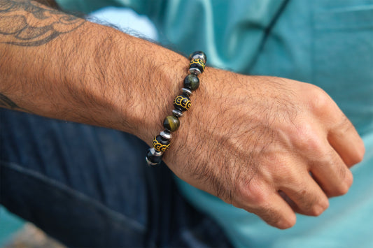 Bracelet homme perles oeil de tigre bleu et perles noires en verre gravée mantra 10mm