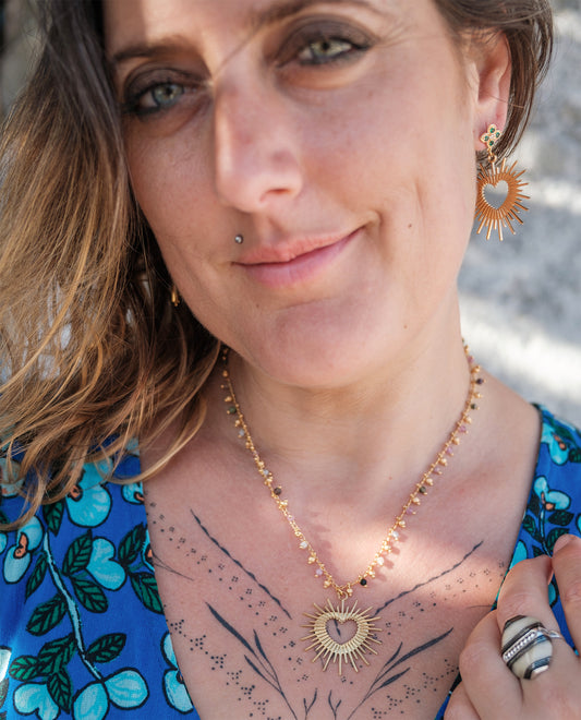 Collier chaine rosaire en tourmaline et pendentif coeur ex voto