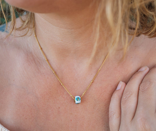 Collier femme en acier inoxydable doré et pendentif oeil emaillé blanc et turquoise
