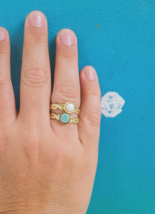 Bague Coquillage réglable en acier inox doré Cabochon nacre, amazonite