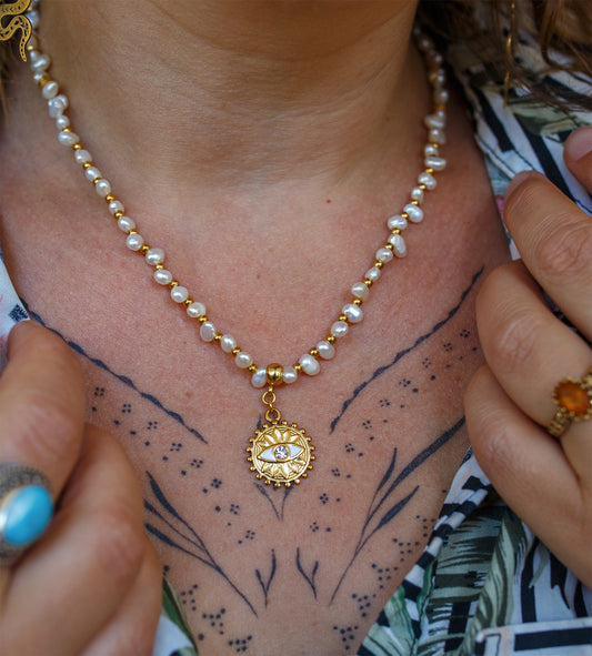 Collier Bohème Talisman en Nacre Blanche & Pendentif Œil – Bijou Fait Main à Cannes