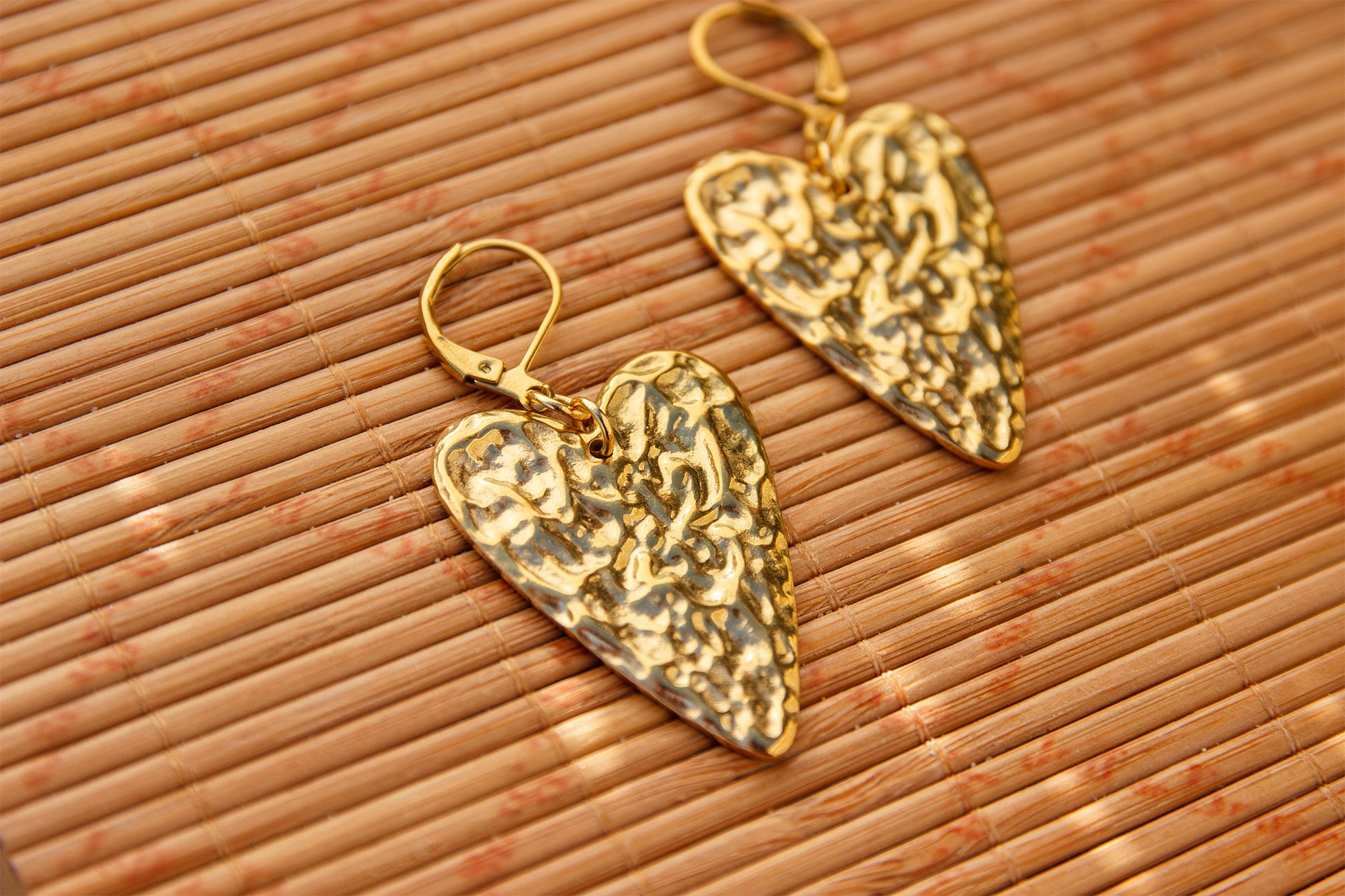 Ces boucles d'oreilles cœur ex-voto allient symbolisme et modernité. Fabriquées en acier inoxydable doré, elles présentent une texture martelée qui apporte un effet lumineux et raffiné à l'ensemble. Le cœur, symbole d'amour et de protection, évoque les vœux et les offrandes, typiques des objets ex-voto. Ce design intemporel et spirituel est parfait pour celles et ceux en quête de bijoux chargés de sens et d'élégance.