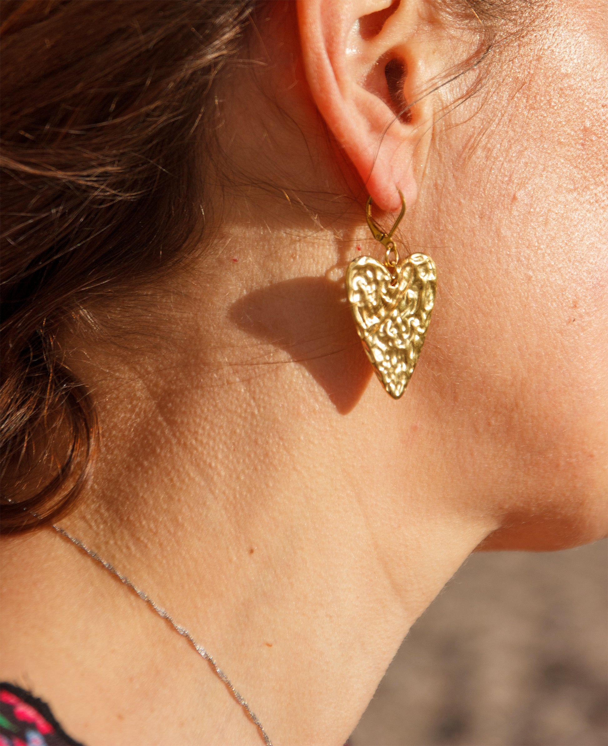 Boucle d'oreille coeur ex voto oeil en acier inoxydable doré effet texturisé vague