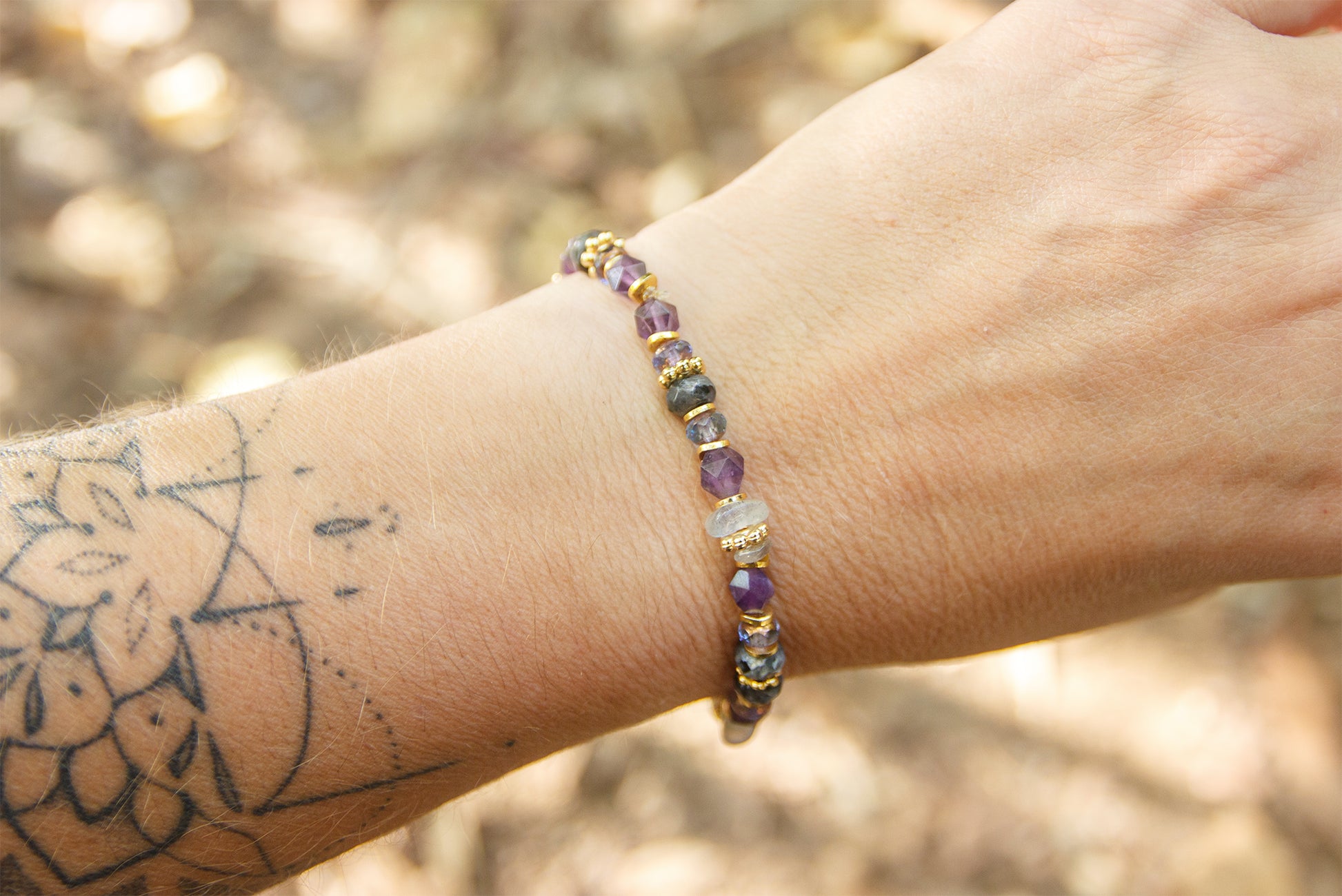 bracelet femme perles d'améthyste, labradorite , perle en verre et chips de labradorite