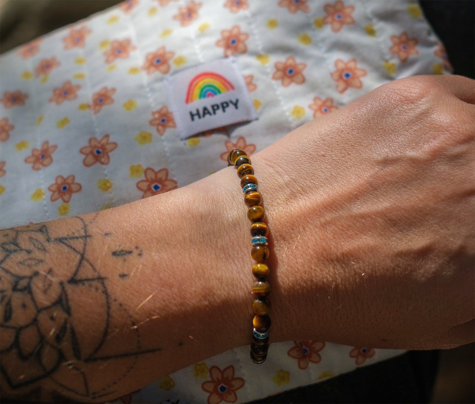 Ce bracelet femme perles oeil de tigre 6mm et intercalaire zirconium turquoise Cauris & Co est réalisé à la main dans mon atelier à Cannes .