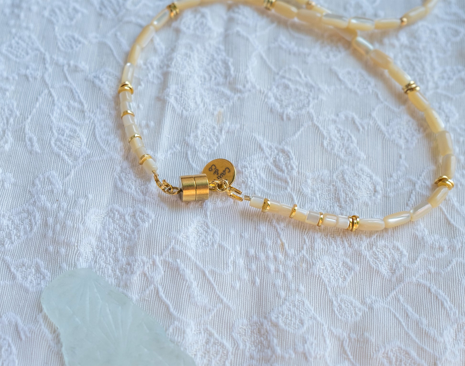 Apportez une touche bohème discrète et élégante à votre quotidien avec ce collier en nacre tube, signé Cauris & Co.