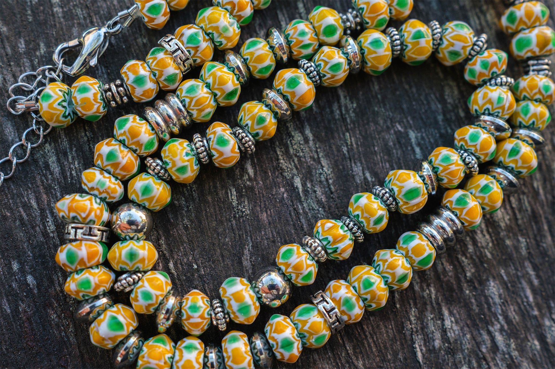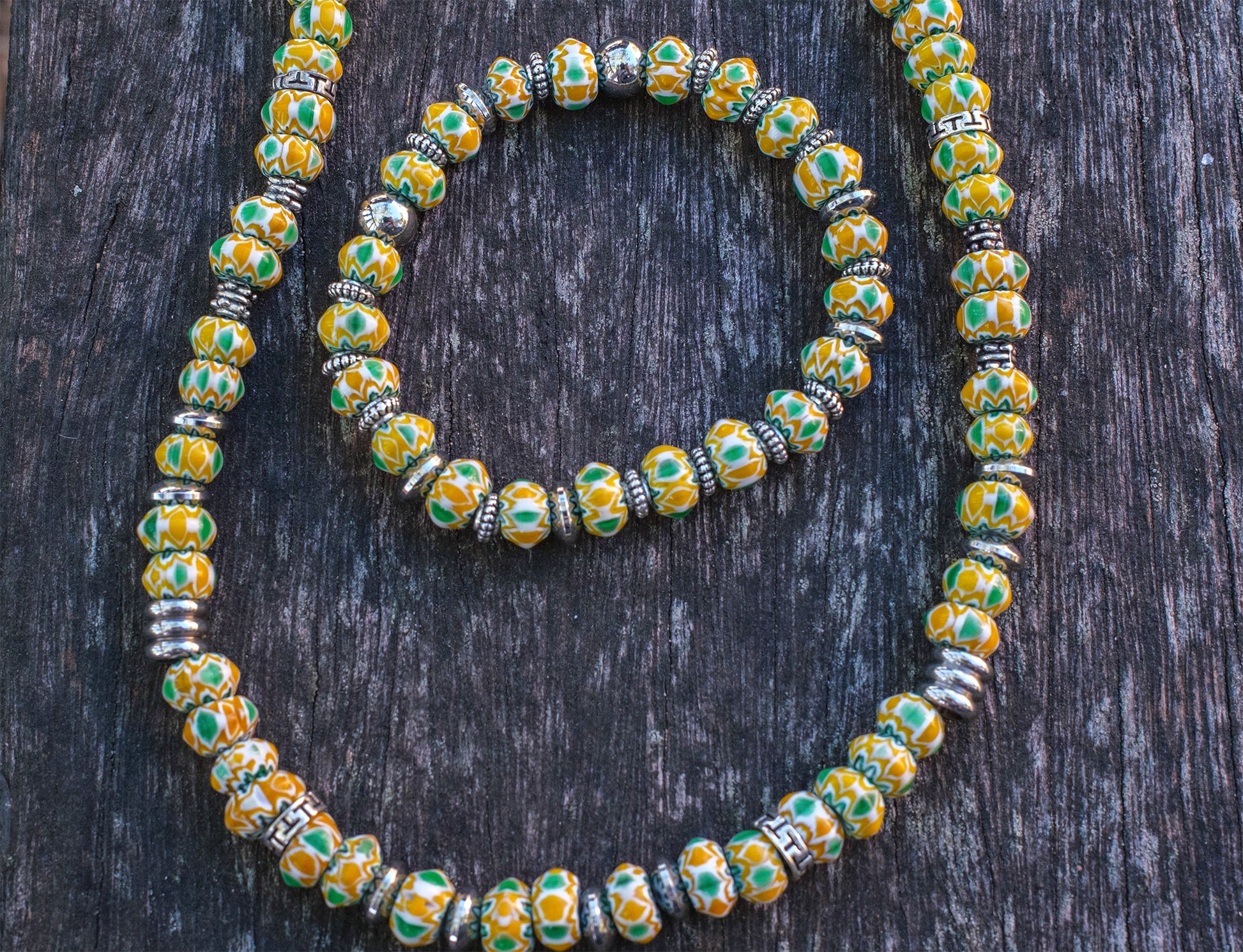 Ce collier homme perles chevrons jaune Cauris & Co (Caurisandco) est réalisé à la main dans mon atelier à Cannes .